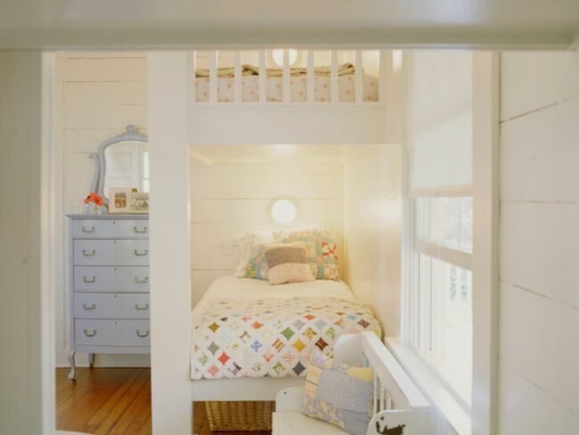 Fresh white bedding pairs beautifully with patterned pillows that introduce just enough visual interest to the room.