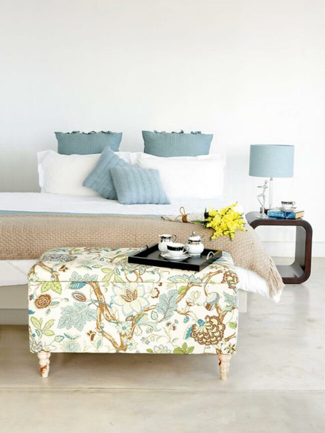 The floral ottoman at the bed's foot adds natural charm while serving as a spot for the black tray holding tea cups and small decorative jars.
