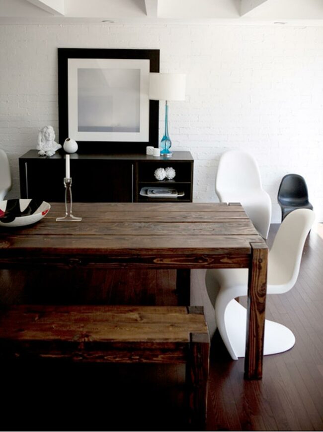 The contemporary dining set features clean-lined white chairs that complement the simple table design without overwhelming the space.