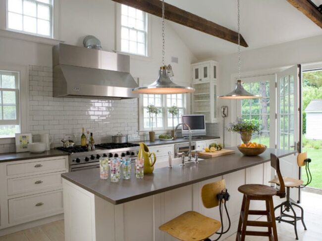 Sunlight pours through the windows of this refreshing white kitchen, creating a clean and airy atmosphere that instantly makes everyone feel welcome.
