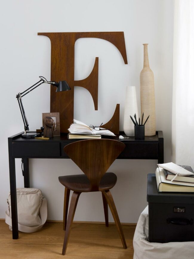 Tall light-colored vases complement a distinctive rusty metal letter "E," adding artistic personality without overwhelming the clean design.