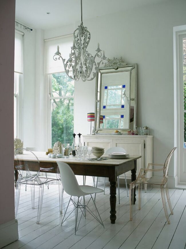 Clear chairs circle the table with one white seat adding a fun twist to the traditional dining set.