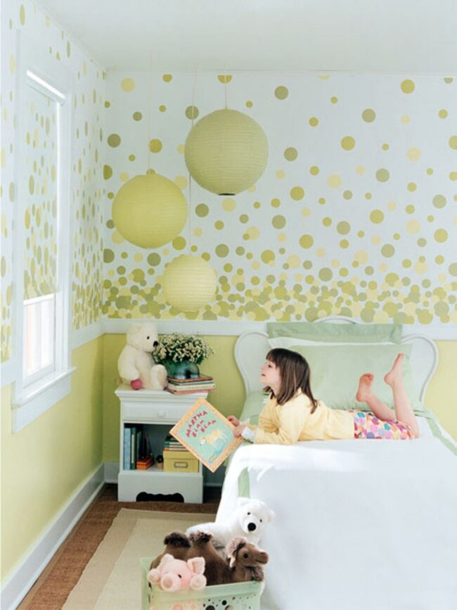 Cheerful yellow polka dots blanket the walls, creating a fun confetti-like effect that instantly lifts the mood in this bedroom.