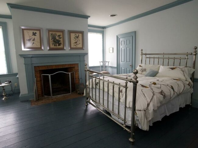 Beautiful blue-gray walls create a calm atmosphere in this bedroom, complemented by a classic metal bed frame topped with white floral-patterned bedding.