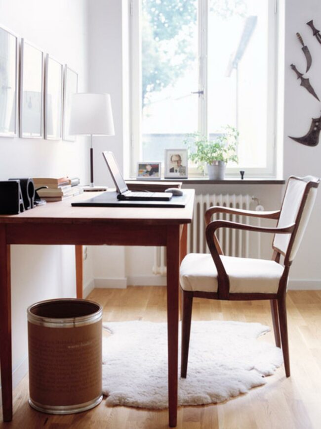 This office corner successfully balances vintage elements with modern touches for a timeless appeal.