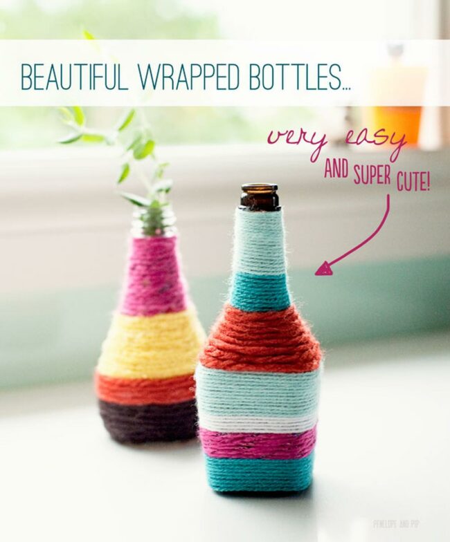 Yarn-wrapped bottles are a delightful way to transform ordinary glass containers into colorful decorative pieces.