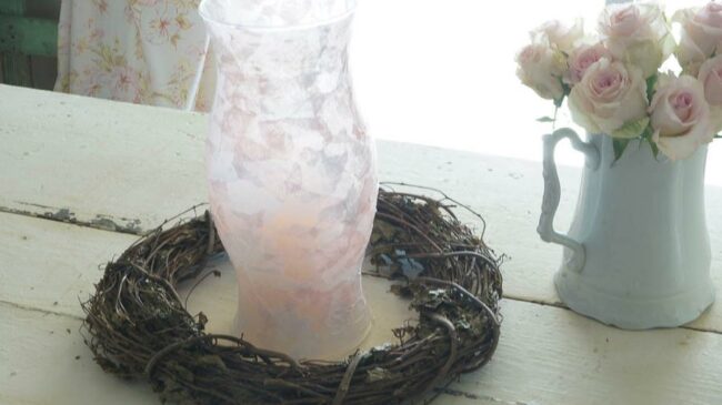 Pale pink roses nestled in a white ceramic pitcher complement the rustic wooden surface surrounding the delicate glass candle holder.