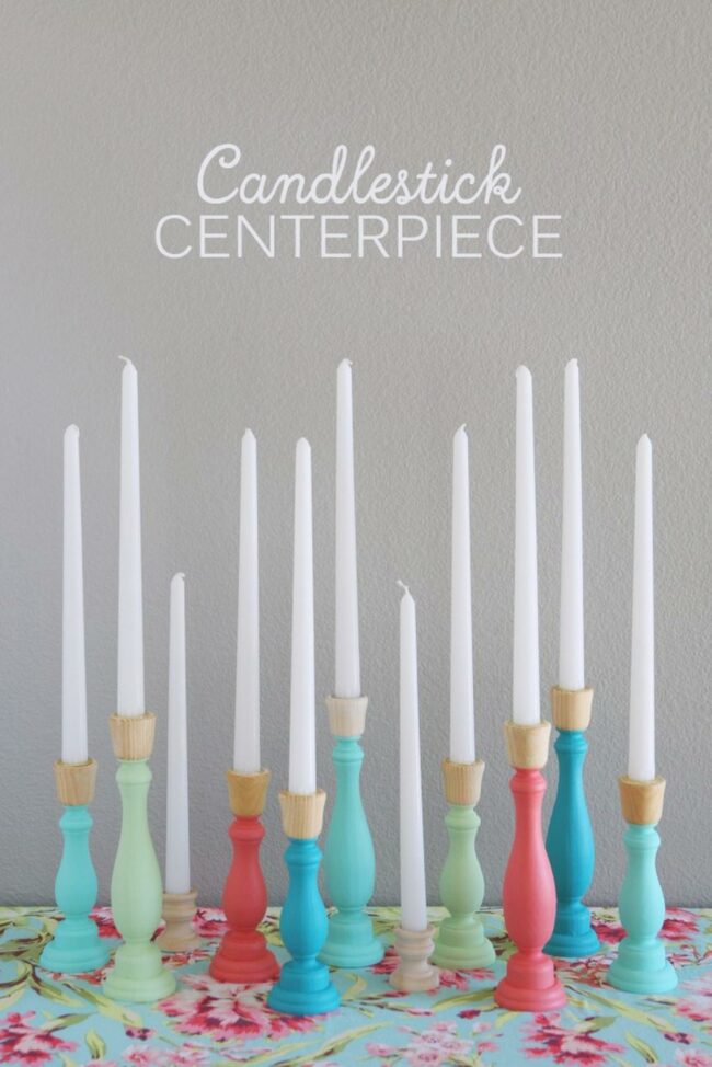 Complementing these playful pieces, two plain white candles provide a clean, simple backdrop that makes the colors truly shine.