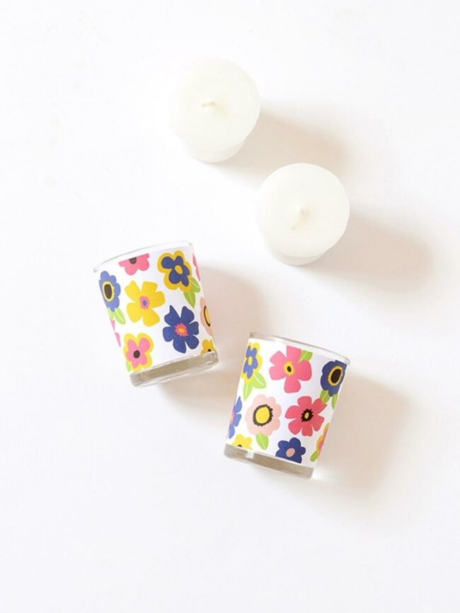 Colorful flower patterns dance across two small candles, nestled in clear glass containers that showcase their vibrant charm.