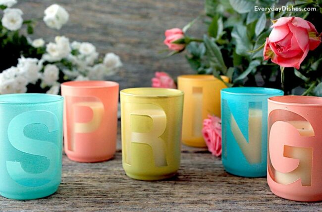 Bold letters etched across each glass spell out the vibrant word "SPRING" in eye-catching style.