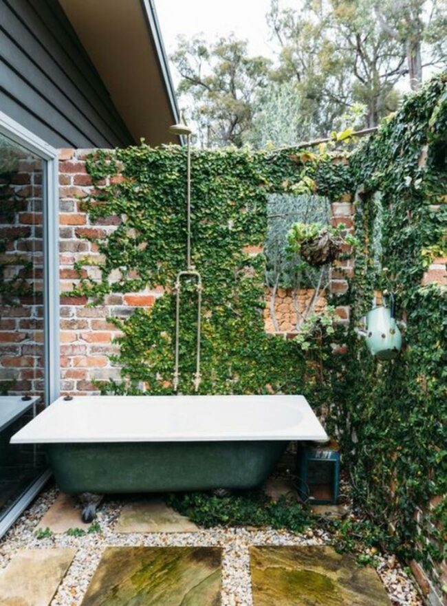 Brick walls draped in lush green ivy create a natural sanctuary for bathing outdoors.