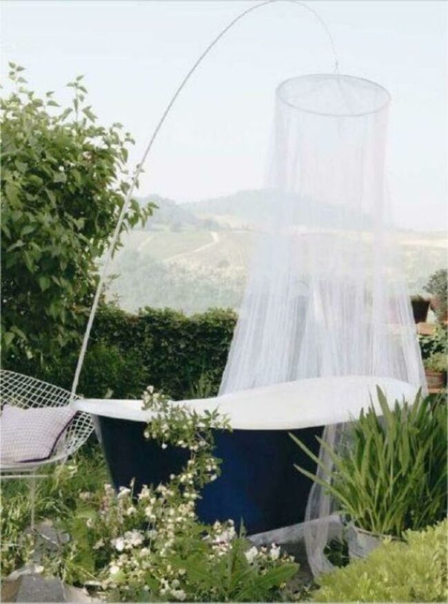Dark blue bathtubs with garden settings are stunning outdoor relaxation zones that instantly draw attention.