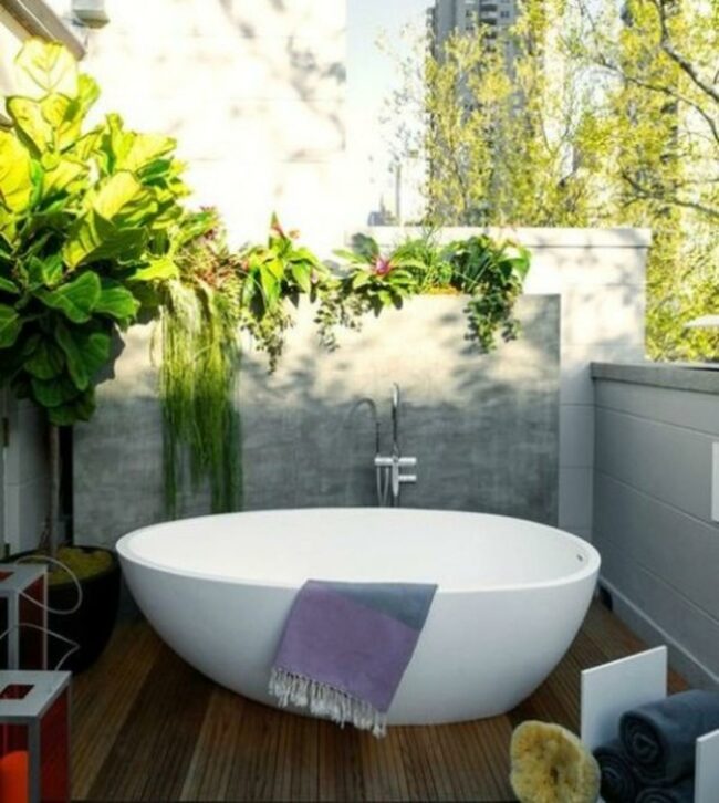 Outdoor bath spaces are peaceful havens that blend nature with relaxation.
