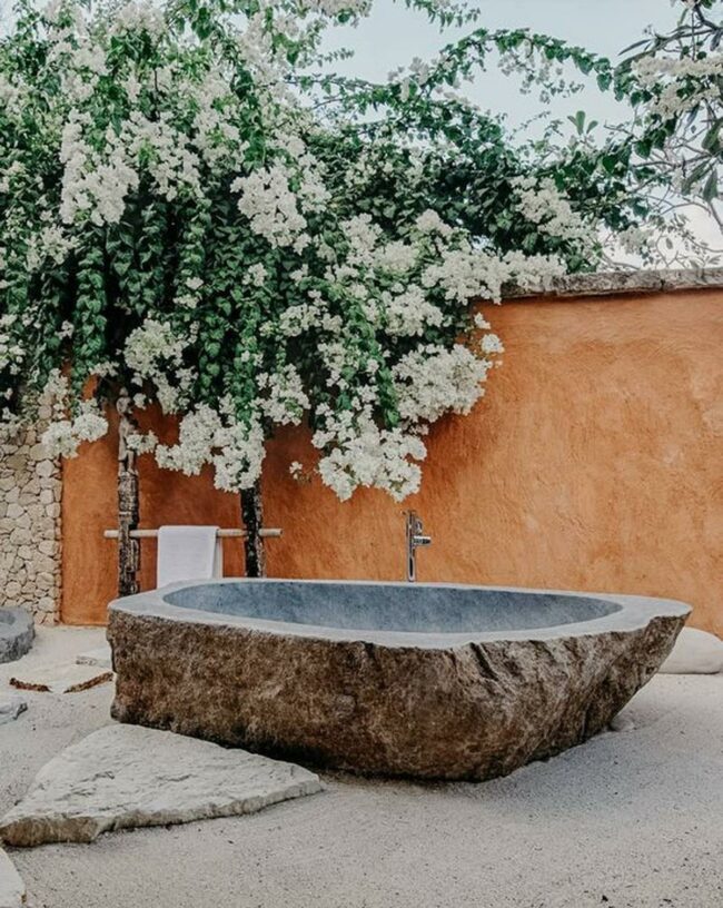 Cool stone and organic textures make this outdoor bathing experience feel luxurious and peaceful.