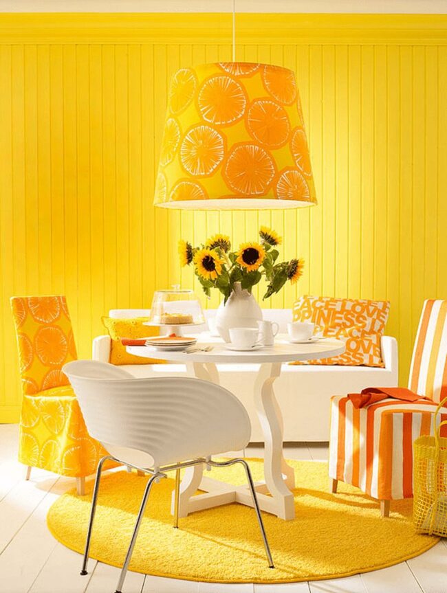 Overhead, a bold lampshade decorated with vibrant orange slices instantly captures attention.