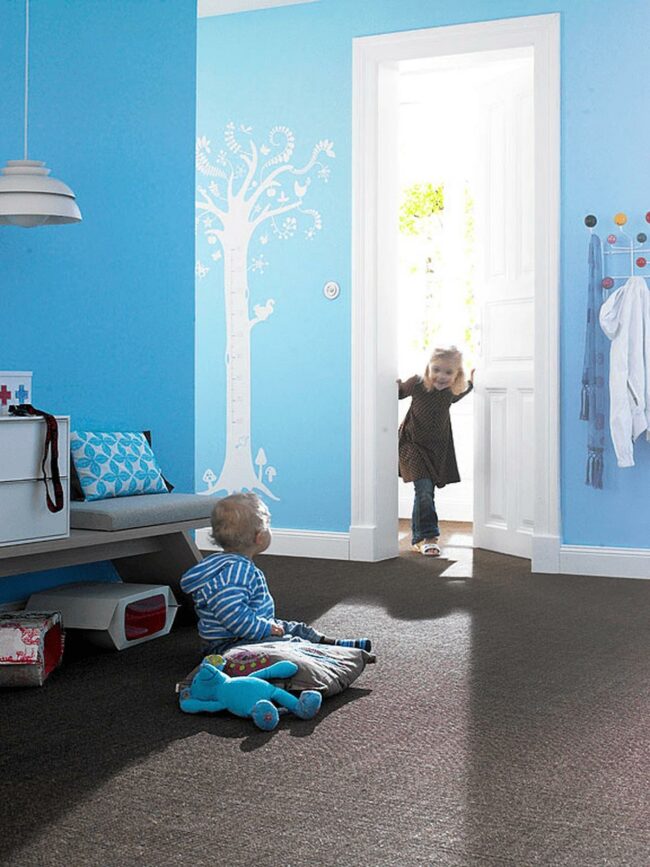Blue walls create an energetic backdrop for this delightful kids' room, instantly capturing attention with its playful spirit.