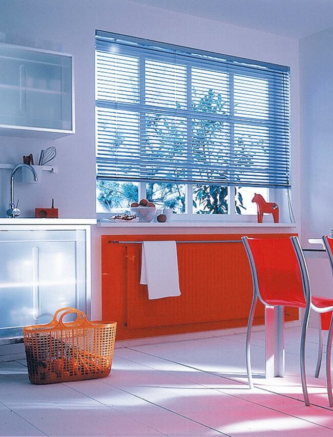 Large windows draped with blue blinds flood the room with natural light, instantly lifting the mood.