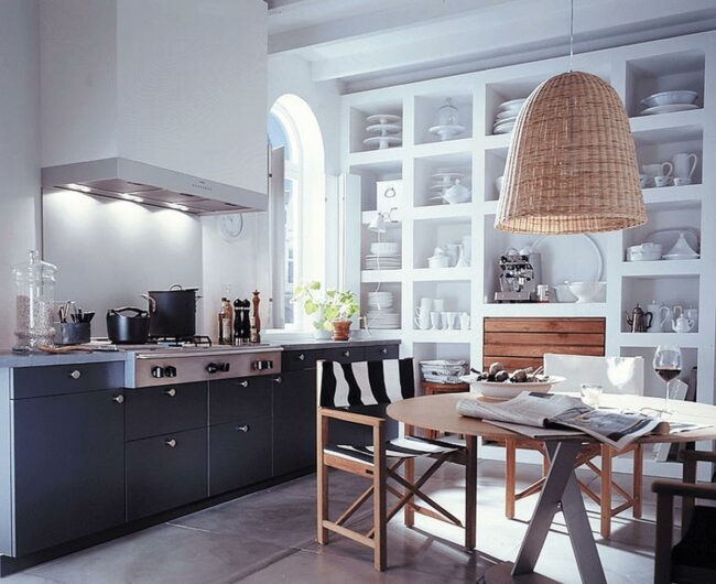 Dark cabinets dramatically define this kitchen's character, creating sharp contrast against pristine white walls and shelves.