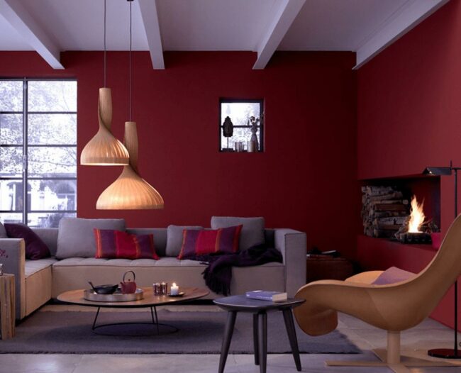 Natural light streams through large windows, balancing the rich wall color and creating a harmonious environment.