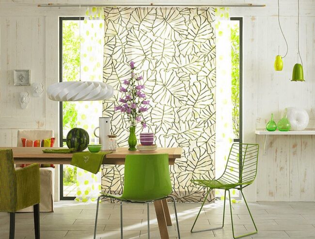 Curtains with playful leaf patterns connect the indoor space to natural elements outside.