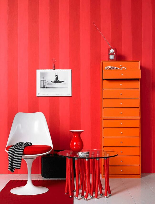 Glass tables with stick-like red legs dance nearby, complementing the dynamic wall color with unexpected design elements.