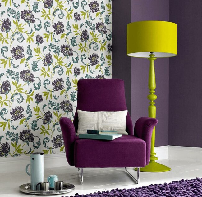 Dramatic floral wallpaper covers the wall behind a luxurious deep purple chair, blending nature's palette with sophisticated design.