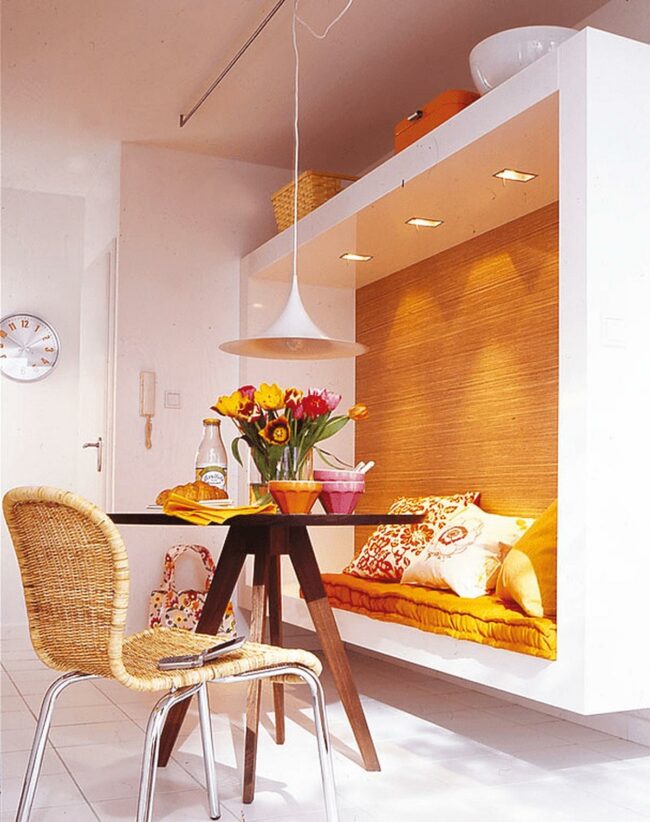 Soft yellow cushions and patterned pillows instantly warm up the built-in bench nook framed by crisp white walls.