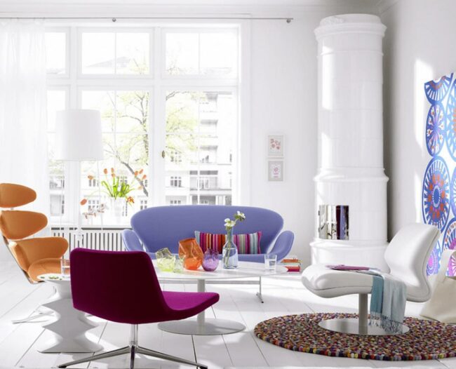 Magenta and white chairs provide additional comfortable seating, complemented by a playful round rug featuring intricate multicolored threads.