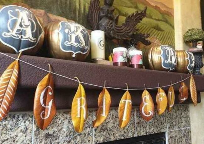 Real autumn leaves in beautiful orange and yellow shades hang across the front, spelling out "GRATEFUL" in simple white letters.
