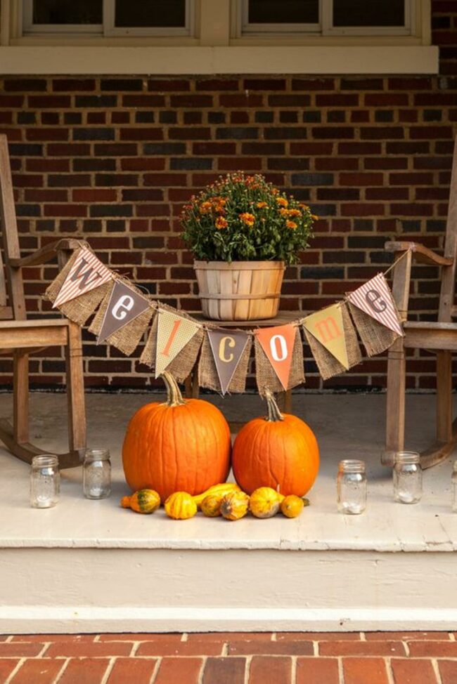 A handmade "welcome" banner in cozy autumn colors hangs between the chairs, showing off crafty personal style without saying a word.