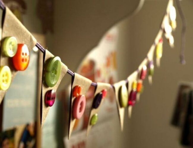 Party-ready paper pennants with colorful buttons add instant cheer to any room with their handmade charm and playful energy.