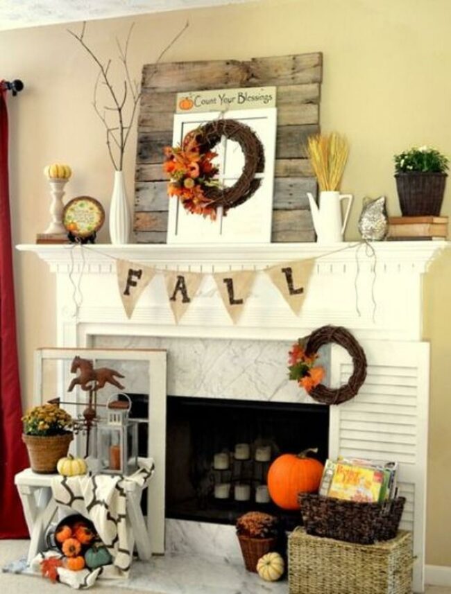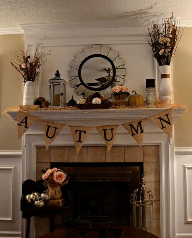 Wooden mantels bring charming character to any space, especially when adorned with festive fall garlands featuring pumpkins and autumn leaves.