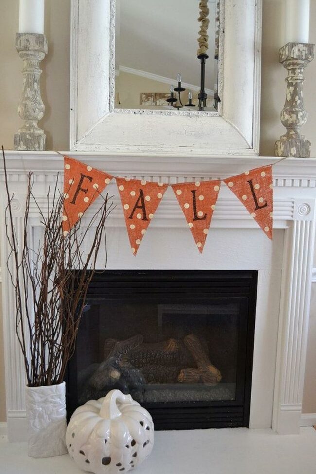 Fall decorations create a warm, inviting atmosphere throughout this living room where a charming burlap "AUTUMN" banner stretches across the white fireplace mantel.