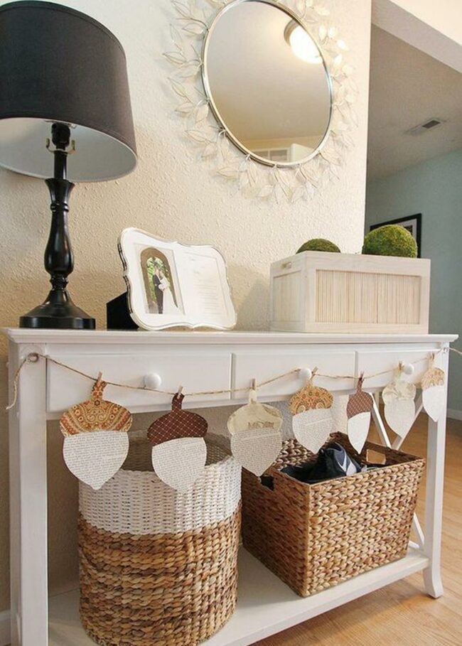 Paper acorn garlands draped across the front add a whimsical touch that changes the mood from ordinary to special in seconds.