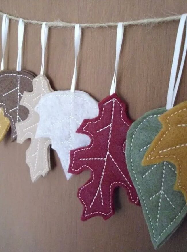 Fall colors shine through this handmade felt leaf garland strung along rustic twine, perfect for adding warmth to any room.