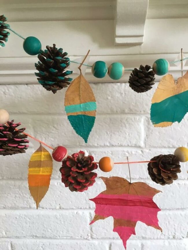 Fall's most eye-catching decoration combines painted striped leaves in teal, pink, and yellow with rustic pinecones and wooden beads, forming a delightful garland that stands out beautifully against white brick walls.