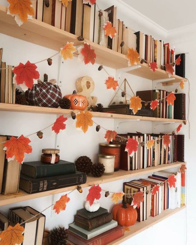 Beautiful orange and red leaf garlands drape gracefully across the bookcase, capturing the essence of autumn in your reading space.