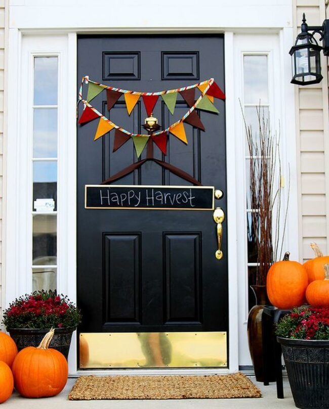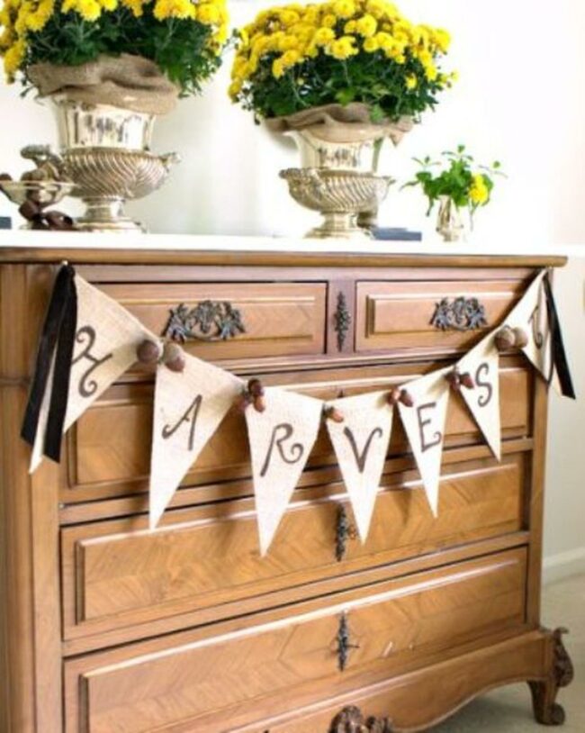 The charming "HARVEST" banner, made from simple fabric triangles, creates a welcoming atmosphere that makes everyone feel right at home.