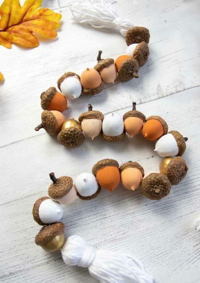 Painted acorns in warm white, gold, and orange hues create a charming seasonal decoration that captures fall's essence.