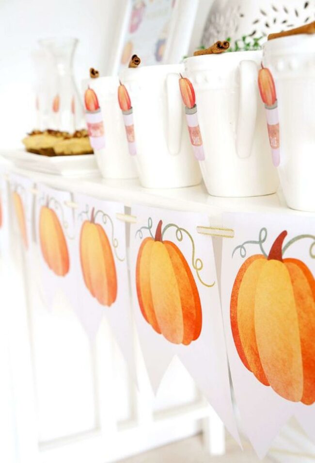 Festive orange pumpkin banners drape elegantly along the white table's edge, adding a splash of seasonal color without overwhelming the space.