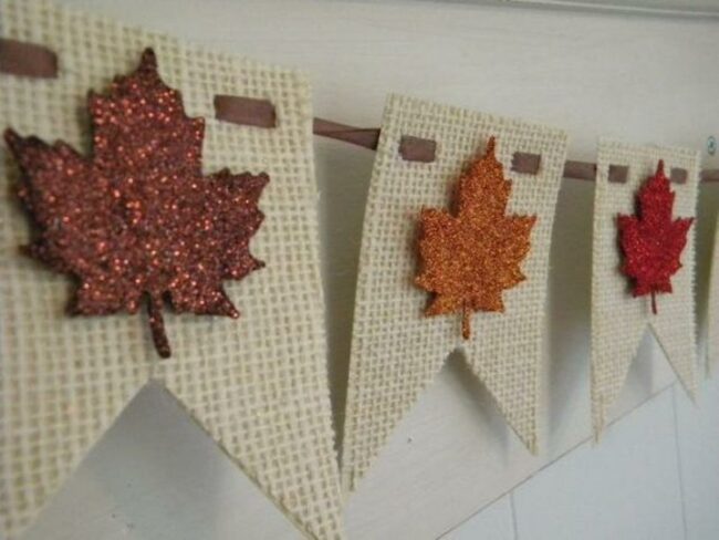 Fall magic comes alive with these sparkly leaf decorations that shimmer in rich reds, oranges, and browns against natural burlap flags.