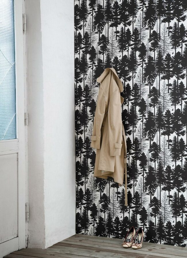 Smart design meets everyday comfort in this black and white tree-patterned corner where the eye-catching wallpaper instantly grabs your attention.