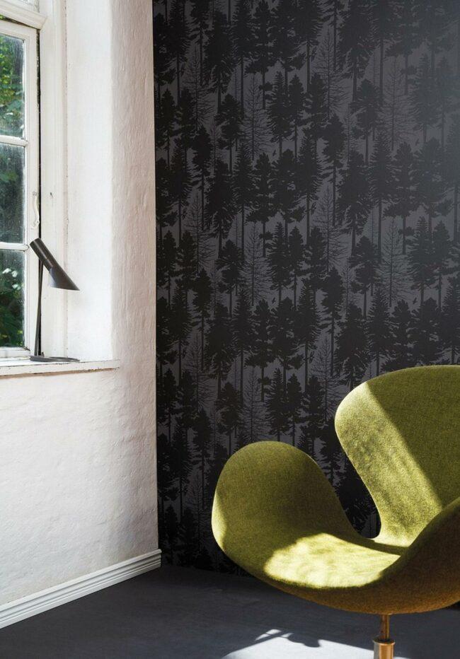 Dark wallpaper featuring tall tree silhouettes creates a natural backdrop that draws the eye upward and adds unexpected drama to the space.