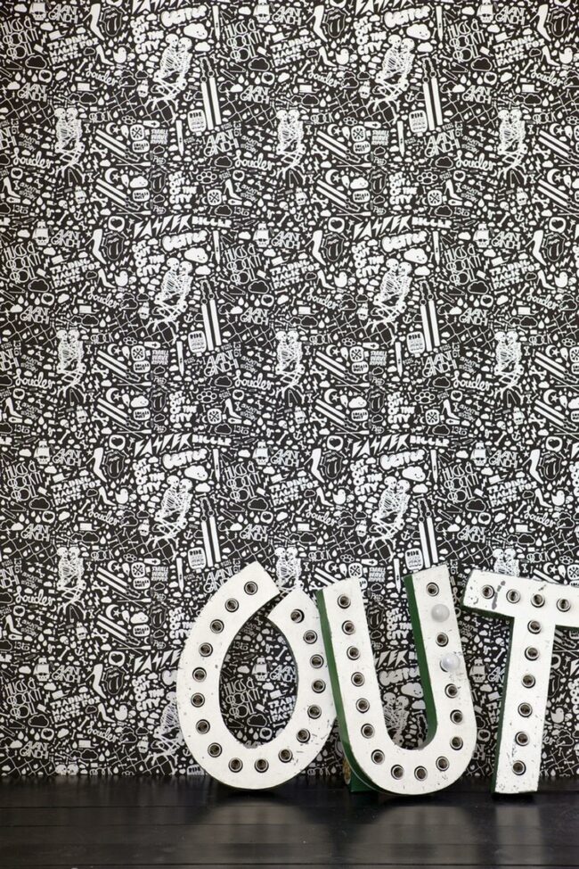 Black and white doodle wallpaper creates a playful backdrop in this lively room where your eyes naturally bounce from one quirky drawing to the next.