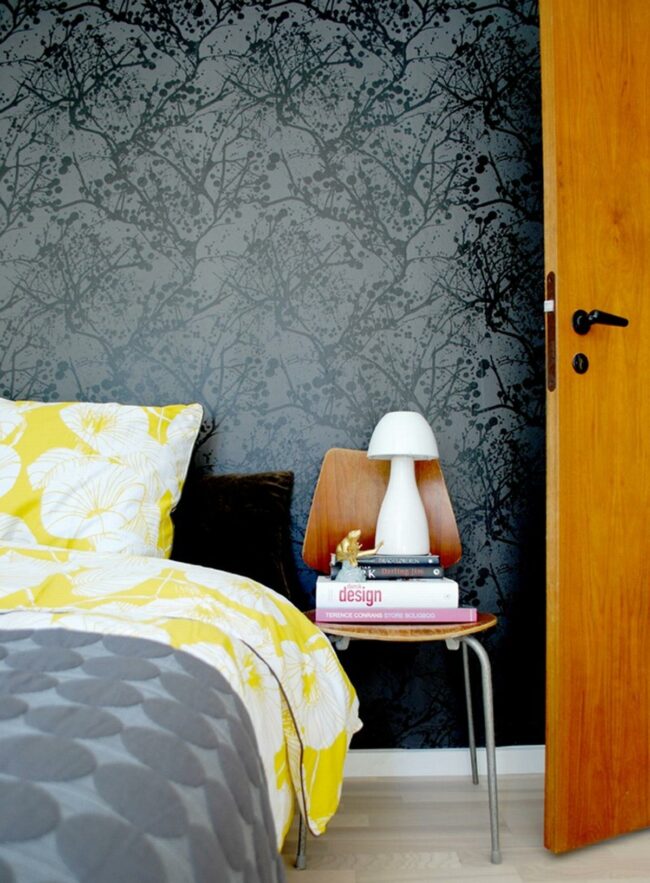 Dark walls featuring a delicate tree pattern create dramatic depth in this inviting bedroom, while sunny yellow bedding with white floral designs adds a cheerful pop against the moody backdrop.