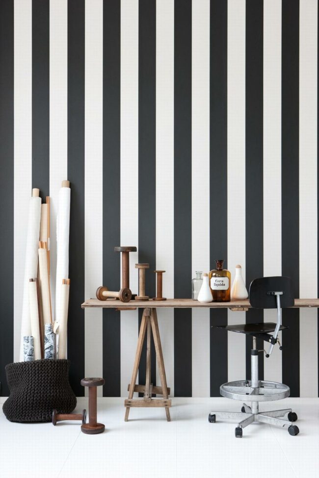 Black and white stripes reach dramatically up the walls, making a bold statement in this creative workspace.