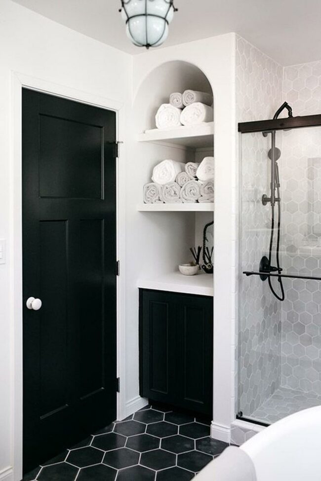 Black and white harmony creates a fresh bathroom aesthetic with dark hexagon floor tiles complementing the black door and cabinet perfectly.