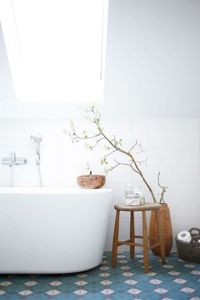 You can easily recreate this look with some statement tiles, a few hardy bathroom plants, and natural wood accents.