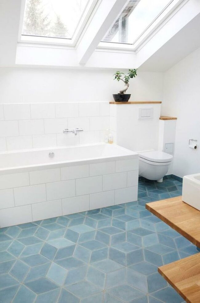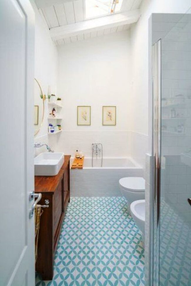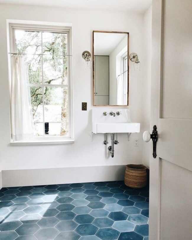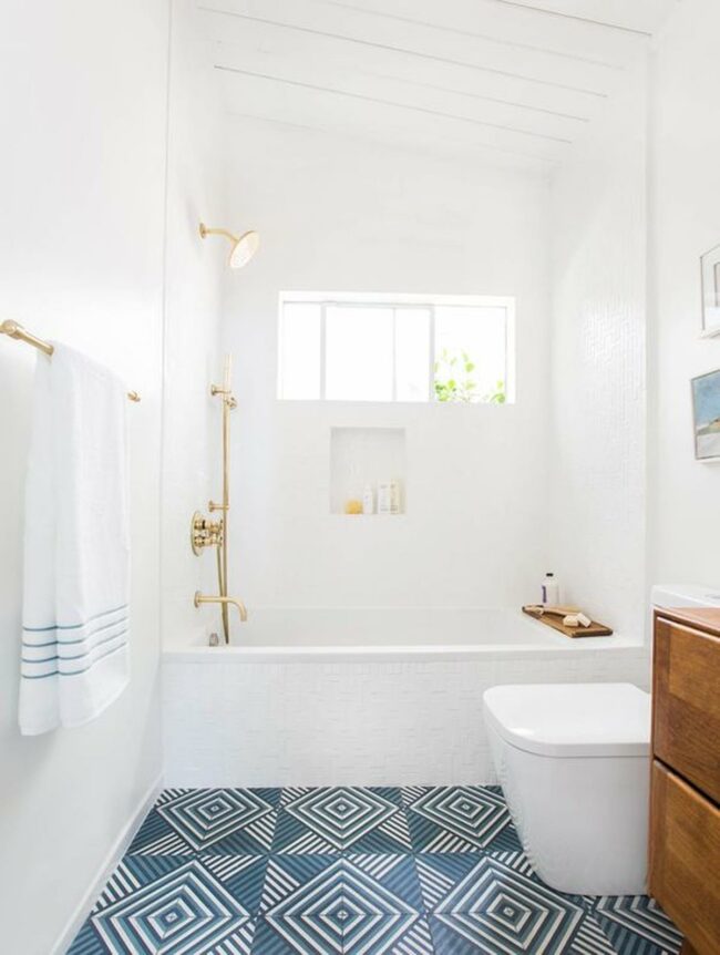 The eye-catching blue and white patterned floor tiles add personality without overwhelming the clean design.