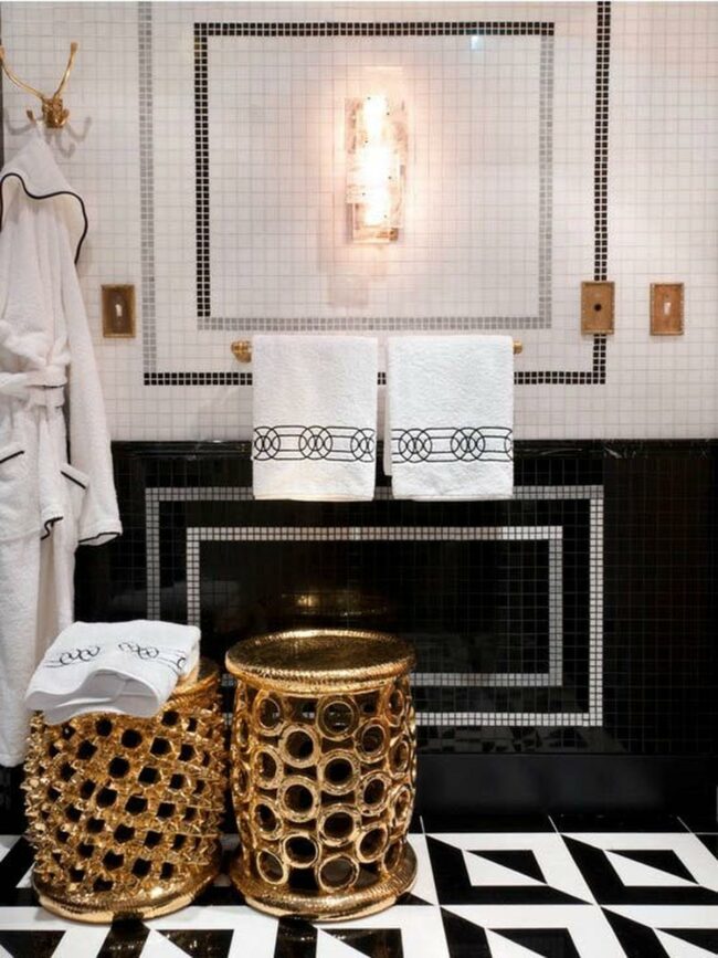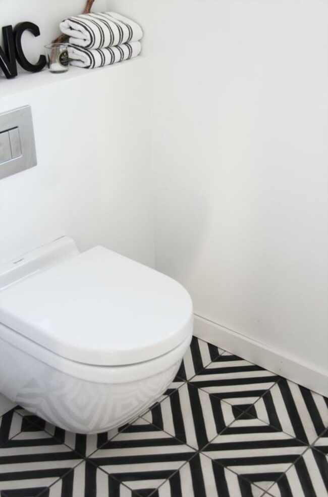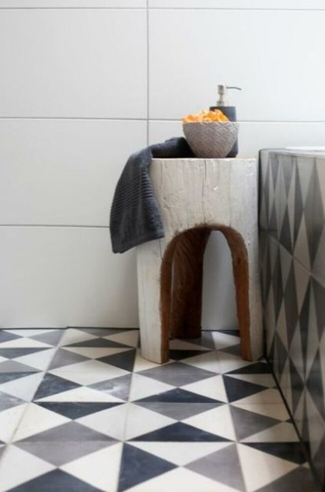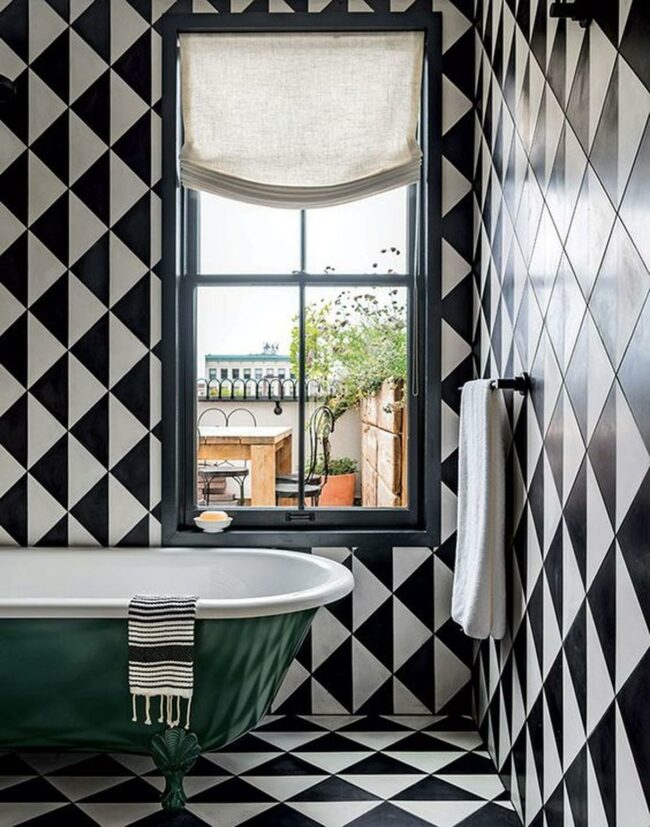 Striking black-and-white triangle patterns on the floor make this bathroom truly special, drawing attention as soon as you enter.